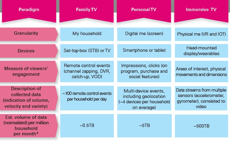 The legacy paradigm (“Family TV”) has measured viewer data captured by devices such as the set-top box at a household level. It has logged what is being watched when. A conservative estimate of 100 events captured per household per day, could translate into a data volume of approx. 0.5TB per million households (HH) per month (order of magnitude assuming 1 TV/STB per HH).